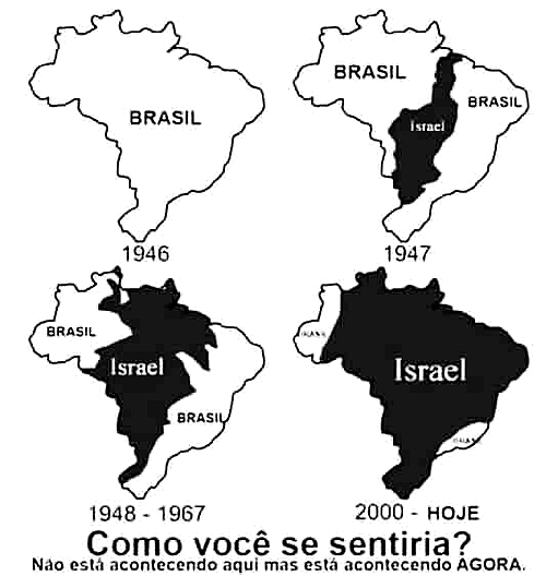 E se os sionistas achavam que deviam ter um território o mais justo era tomar para si uma parte da Alemanha. Afinal, foi onde ocorreu o Holocausto. É injusto ocupar um território habitado há centenas de anos por palestinos que nada tiveram a ver com os crimes de Hitler. Ainda hoje colonos israelenses avançam sobre o território palestino, massacrando famílias, queimando suas plantações, estuprando, destruindo suas casas. Enfim, a melhor imagem para se entender o que vem a ser o sionismo é esta abaixo:
