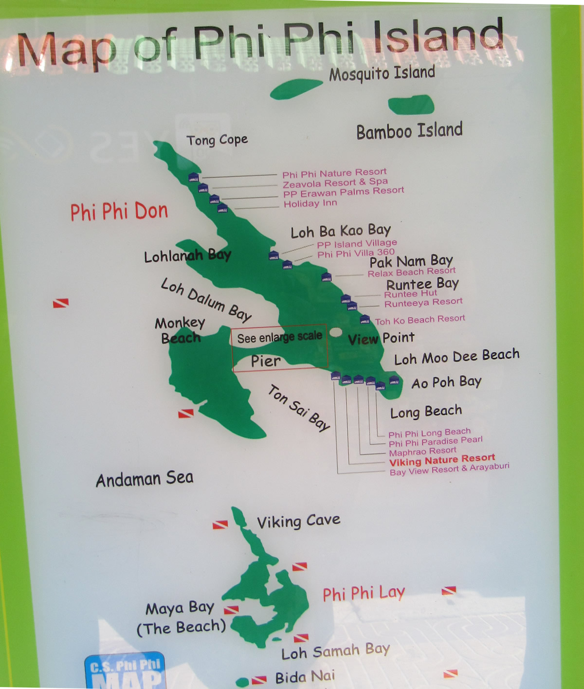 A praia mais frequentada chama-se Loh Dalum Bay, (veja no mapa), para entender. Fica naquele pedacinho de terra entre o píer e o outro lado da ilha, o lado oeste. A vantagem é que é a praia de mais fácil acesso. Acho, bem útil, entretanto, ter um mapa de Phiphi Island, entender a ilha.