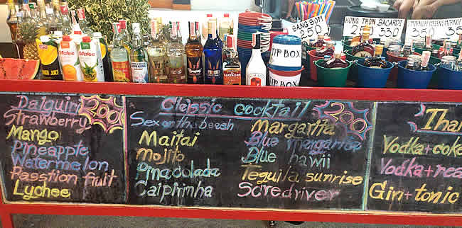 Em certos horários do dia nessas ruas o movimento de turistas em Phiphi Island é intenso (para tirar essa foto numa rua secundária e vazia tivemos que acordar cedo…) e, como falei, o perfil é outro. Assim, existem muitos bares com ótimos drinks e o pessoal enche a cara. Logo, não se espante se cruzar com alguns tão bêbados que estão “cercando galinha”.
