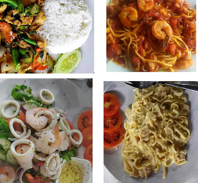 Mas há, assim também, opções semelhantes com vegetais, carne ou galinha. Você encontra todo tipo de prato, como lasagna, pizza e pratos ocidentais de diferentes países. Pizza são servidas a qualquer hora do dia. São diferentes das brasileiras. Na Tailândia a massa é fina demais (creio que a farinha de trigo também não é tão boa na Tailândia).